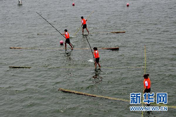 6月5日,武汉商业服务学院体育系学生在武汉东湖端午文化节上表演特色民族传统体育项目——独竹漂。