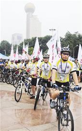 昨天,21名业余自行车手从汉口江滩出发,开始了一次传播低碳的“绿色长征”——“骑行千里看世博”:骑行1200公里,穿越18个城市,到上海看世博。