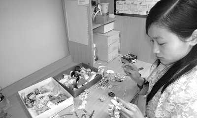 漂亮的粉格百褶弹夹、精致的紫心双翅蝴蝶手机挂饰、可爱的笑脸猫抽纸盒……在武汉商业服务学院,人力资源专业大一女生陈希从头上戴的饰品、身上穿的衣服到日常生活用品,几乎都是自己亲手做的。