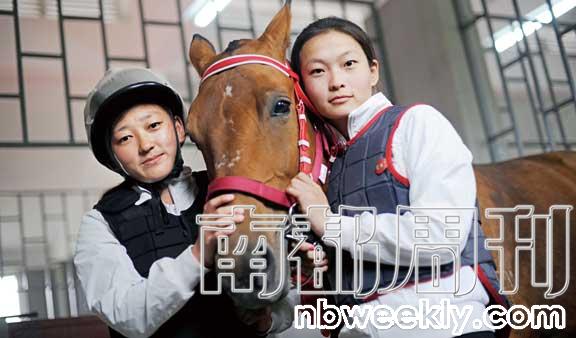 武汉商业服务学院马术学院骑师班的学生董敏(右)和孙自燕(左)与自己的爱马合影。2011年4月12日,全国高校首个练马场在武汉建成。