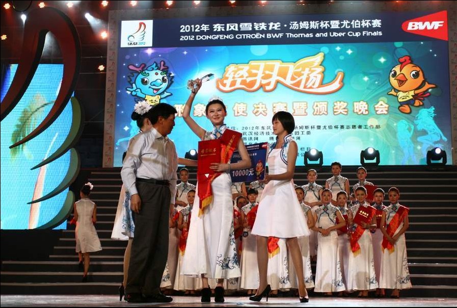 经过为期两个月的海选、复赛、培训,30名最终入围汤姆斯杯暨尤伯杯形象大使比赛决赛的选手在武汉体育中心游泳馆齐聚,竞争20名汤尤杯形象大使的资格。最终来自武汉商业服务学院的30号选手毛晓微夺得冠军,独揽万元大奖。