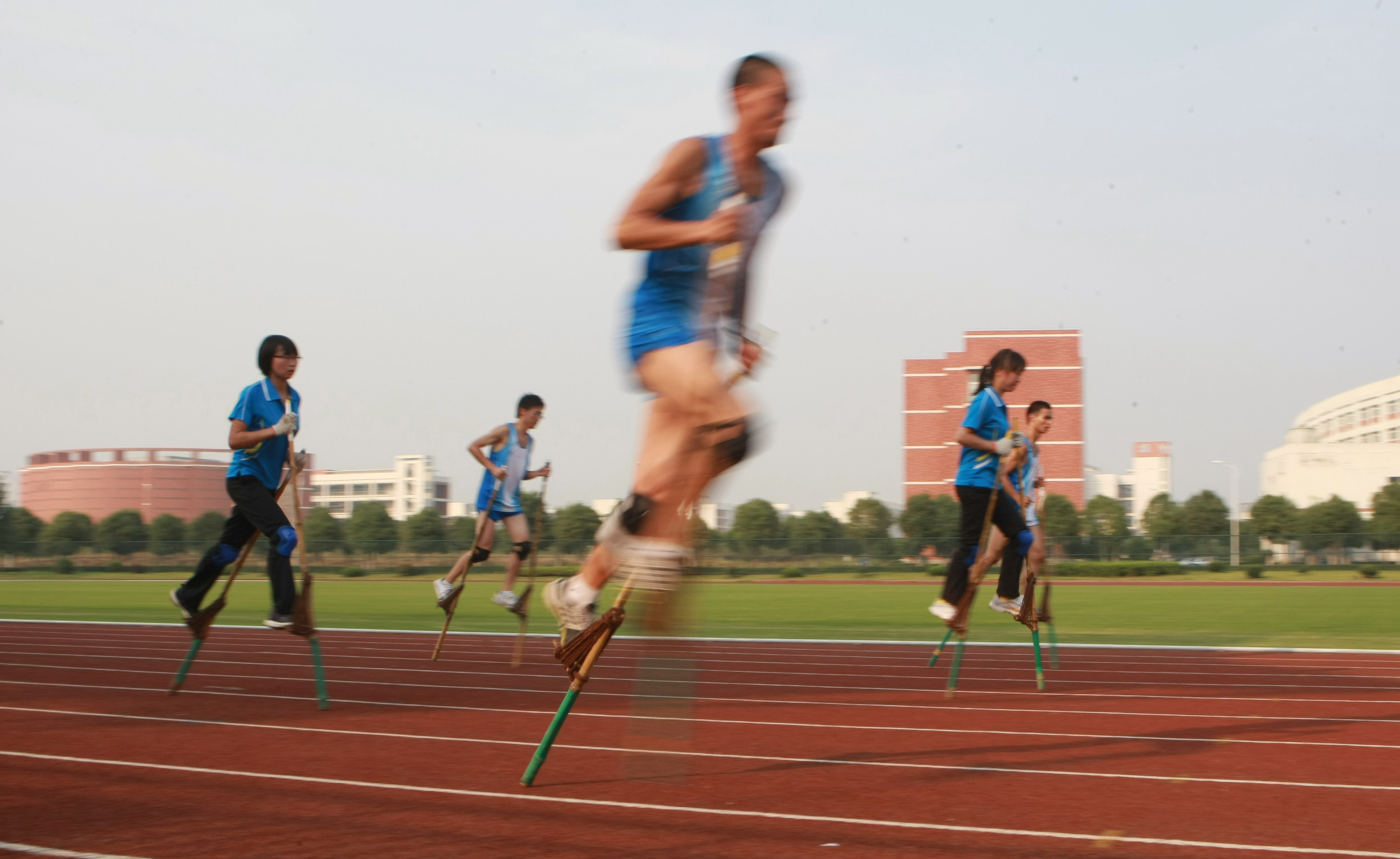 6月14日清晨,武汉商业服务学院田径场上,一群“高人”双手各持一杆,双脚踏蹬大步向前。这5名“高人”是该校高脚竞速训练队队员,每天清晨或傍晚,这里都可以看到他们狂奔的身影。