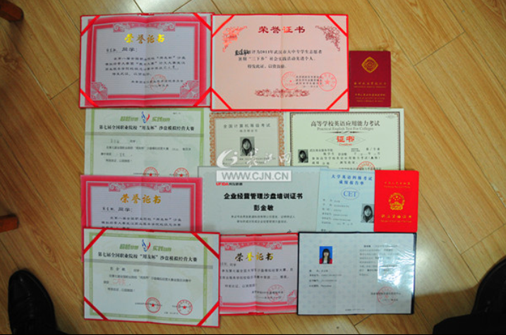 两年十几本证书,彭金敏花费了7000多元,而这一切离不开父母的支持和同学们的鼓励,许多同学认为她很上进,拿着这么多证书以后找工作会更有底气,但彭金敏却觉得证书并不能说明能力,她说:“我觉得个人能力比证书更重要,建议大家根据自己的规划来考证,不要为了考证而考证。”