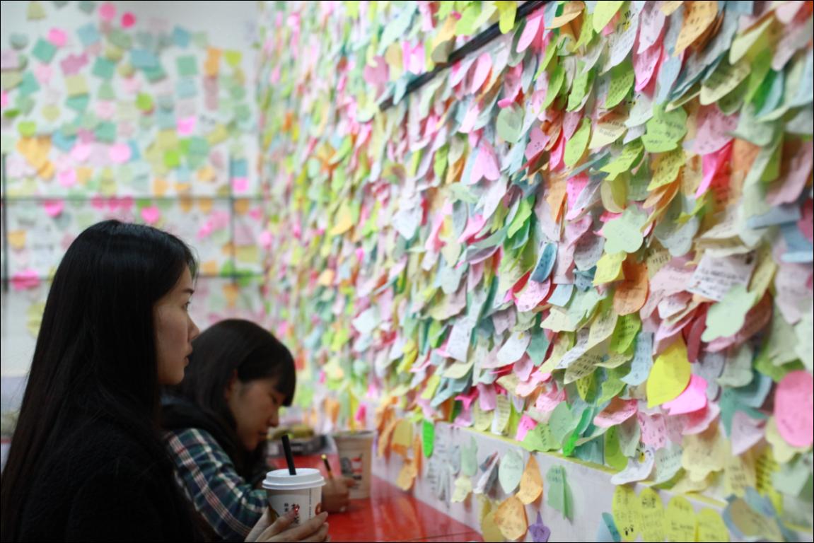 一块长4米、高3米的墙壁,层层叠叠贴满了1500多条写有心情语录的便签纸,或字迹娟秀,或无厘头搞怪。武汉商业服务学院的“心语控”们在奶茶店开起了晒心情的小火车,众学子纷纷加入心语接龙的队伍中来。