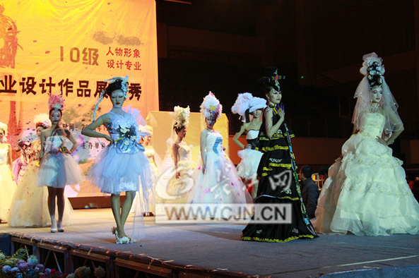 当天的毕业作品展示会,共展示了26套服装,有婚纱、少数民族服装等,学生既是设计师,又是模特。毕业生打破传统设计理念,尽情地秀了一把。