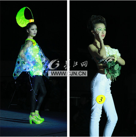 2号模特蒋兵一出场,娇艳的百合、玫瑰花头饰抢尽风头。展出前四天,蒋兵跑到校外的花卉市场买回一束新鲜含苞的百合和玫瑰花,开始做花簇。为了不使花苞过早开放或者在缝制时损坏,没有经验的她费了一番心思。走秀时,蒋兵十分紧张顶在头上的花簇,又要走出模特的状态,短短几分钟的走秀蒋兵双手都汗湿了。