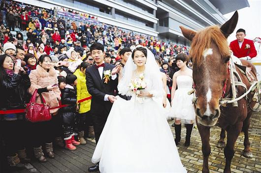 昨日下午,武汉赛马俱乐部年度总决赛在位于东西湖的东方马城举行,久经赛事的男骑师刘学没有参赛,却比以往参加的任何一场赛事心情激动。因为,当天的赛场上,他将迎娶他的新娘——同为骑师的董敏。骑师作仪仗队,马车作婚车……数千名观众见证这一场名副其实的骑士婚礼。