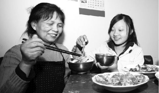 昨晚晚餐时,赵梅(右)在给“宿管妈妈”邹典明夹菜,其乐融融。本报记者王筝摄