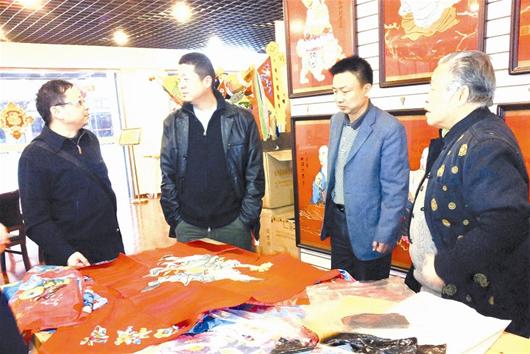 图为:武汉商业服务学院教师与任本荣探讨汉绣发展