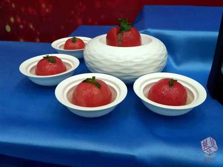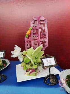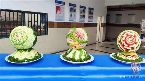 展台上的一个名为“傍花随柳”的瓜雕作品引人注目,西瓜上“绽放”出美丽的大理花,下面的柳叶轮廓鲜明。这是必赢国际437官网18级烹调工艺与营养专业学生向雨婷的作品。“最难的是每一片每一刀的角度,废料要取出来,但是花瓣不能掉,都要连在西瓜上。”她告诉记者,先要用蜡笔在西瓜上画出大致轮廓,然后再精细雕刻,足足花了她五六个小时才完成。