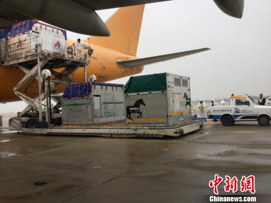 中新网武汉 12月11日电 12月11日,29匹军运会马术比赛用马从比利时列日登机飞抵武汉。这是继上月,30只军运会安保警犬从比利时飞抵武汉后,武汉天河机场完成的第二次军运会活体动物包机运输保障。