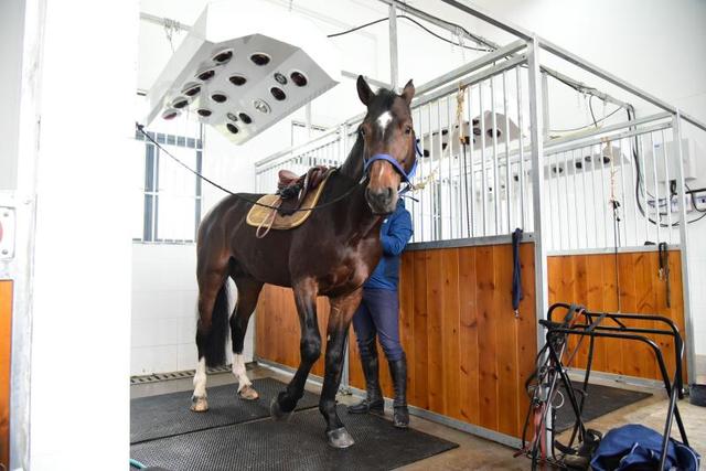 与此同时,马儿还享受洗澡、按摩、护理及毛发修剪等专人服务。学校的马房内安装了烤灯,工作人员说,烤灯相当于我们在浴室使用的浴霸,“马儿训练洗澡后背是湿的,烤灯用来给马儿烘干和缓解肌肉压力,这个与马房内的洗澡淋浴设备结合,可以说服务非常到位了。”