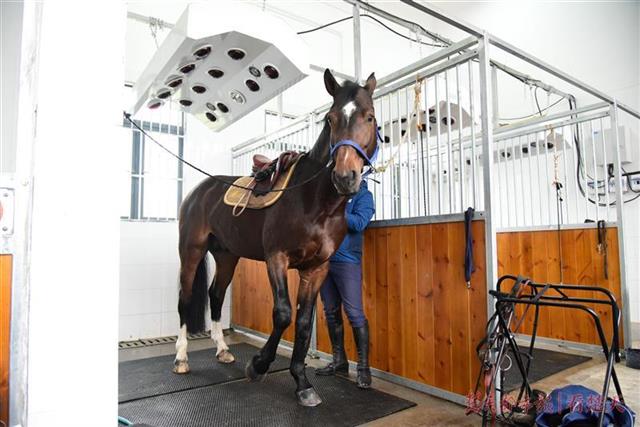 除了天冷加衣,这些马儿还享受着洗澡、按摩、刷毛、毛发修剪等专人护理服务。记者在现场看到一个大型箱体上面有20多个灯,有点像医院里的手术灯。“这是烤灯,是为给马儿烘干和缓解肌肉压力用的。”一名工作人员按下开关:“马儿训练洗澡后背是湿的,容易背痛。我们的这个设备将洗澡淋浴、烘干缓压融合在一起,还能起到杀菌的作用。”这个设备基本可以覆盖一匹马的全身,如果出汗不多,20多分钟就能完成一匹马的护理。