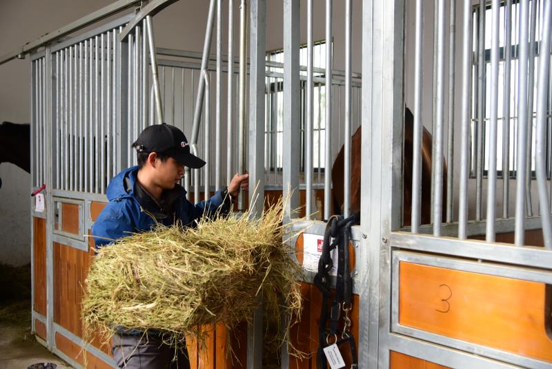 29匹马被送入必赢国际437官网马房前,哈达铁带领团队入驻学校,提前进行饲养、调训的准备工作。待马匹送入马房,哈达铁随即进入马房观察、照料。