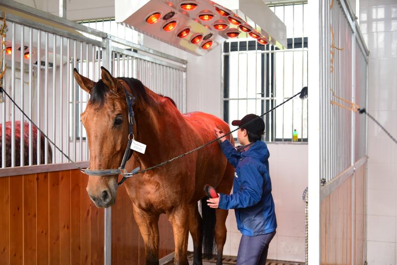 正在为马匹进行按摩的工作人员介绍;“这是为给马儿烘干和缓解肌肉压力用的。马儿训练后洗澡,后背是湿的,容易背痛。我们的这个设备不仅能烘干缓压,还能起到杀菌的作用。”这个设备基本可以覆盖一匹马的全身,如果出汗不多,正常情况下,20多分钟就能完成一匹马的护理。”