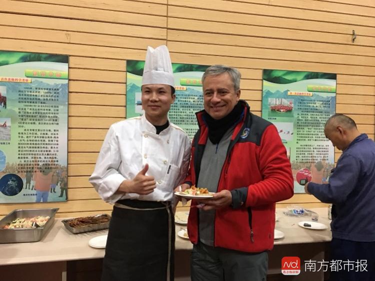 2018年2月,哥伦比亚国防部长和海军总司令官到长城站作客,张磊知道南美国家口味偏甜,花了一晚上备菜,做了红烧肉和糖醋里脊,还做了芝麻糖当点心。两位贵宾对这次大餐很是欣赏,特意到厨房找张磊合影。