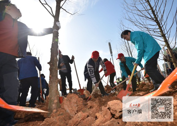 长江日报融媒体3月12日讯 军运会开幕倒计时220天,3月12日,武汉开发区组织机关干部和来自科研、生产一线的车都英才、职工群众等近1000人,在后官湖南岸绿道项目工地开展植树活动,种下了一片军运纪念林。