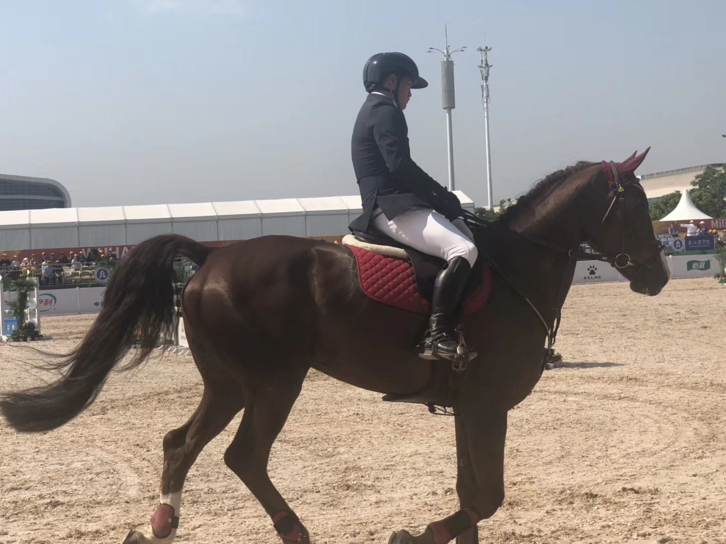 在场地的一众男选手当中,梳着马尾的田雨腰板笔直,格外显眼。“这次太让我吃惊了。”一直在广州比赛的田雨,为这次的马术纤维砂场点赞,“没想到场地的标准这么高,我今天第一次训练自己的马,非常舒服,马的训练状态也很好。”