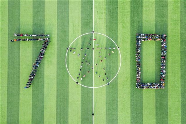 操场上,同学们早早地就列队集中起来。在绿色背景板下,学生们排成了“70”和五角星的标志,挥舞着手中的国旗,齐声高唱《我和我的祖国》。现场气氛热烈,学生们情绪高涨。