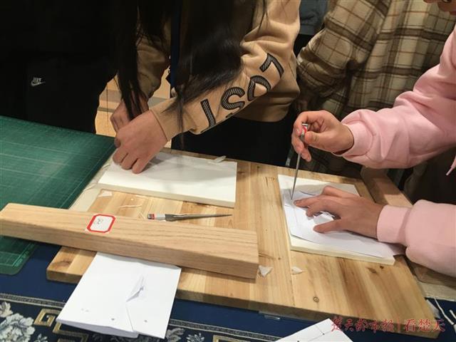 “打孔的间隔需严格控制,线的长度是纸张长度的十四倍,穿线时要注意两股线定要平行。”为了方便大家操作,丁丽萍每做一个步骤都特意减慢了速度。“你看,你打孔的时候要垂直,力度要控制好,手不能抖。”丁丽萍指导着一名学生修正打孔姿势。