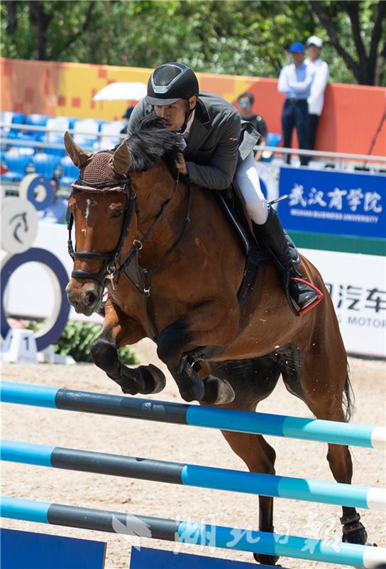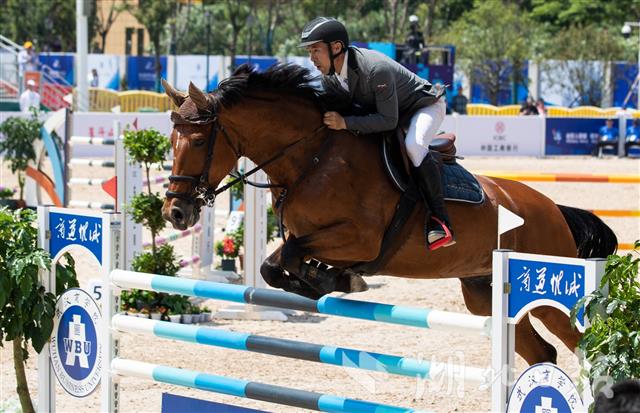 5月11日,北京队选手巴根驾驭赛马在进行1.5米级别个人赛。