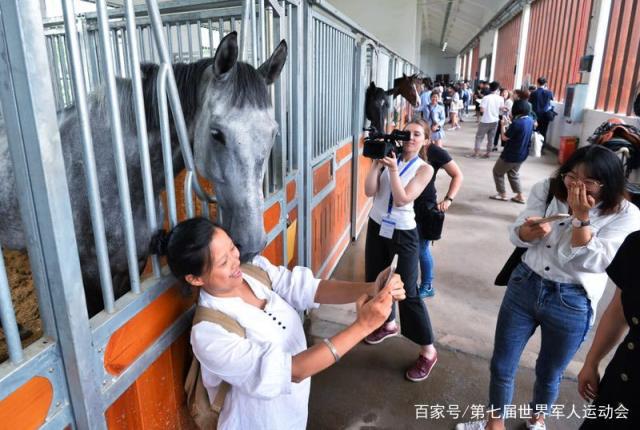 在马厩,看着一批批温驯的高头大马眨着眼睛,媒体人员情绪一下都调动了起来,他们争相抚摸马头或与马匹合影。