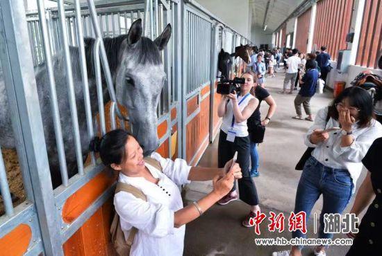 在马厩,看着一批批温驯的高头大马眨着眼睛,媒体人员情绪一下都调动了起来,他们争相抚摸马头或与马匹合影。
