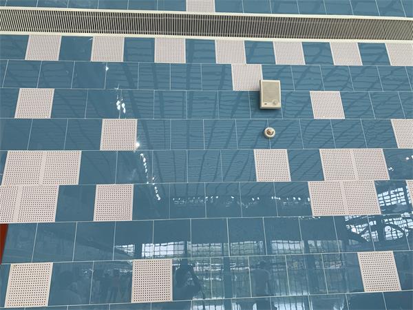 据介绍,游泳馆内顶部铺有2400多块空间平板吸声体,与池岸墙面干挂陶铝板材料共同组成吸声系统,将游泳比赛产生的混响时间控制在2.5秒以内,避免噪声干扰比赛。媒体代表们在现场体验到了“呐喊无回声”的神奇效果。