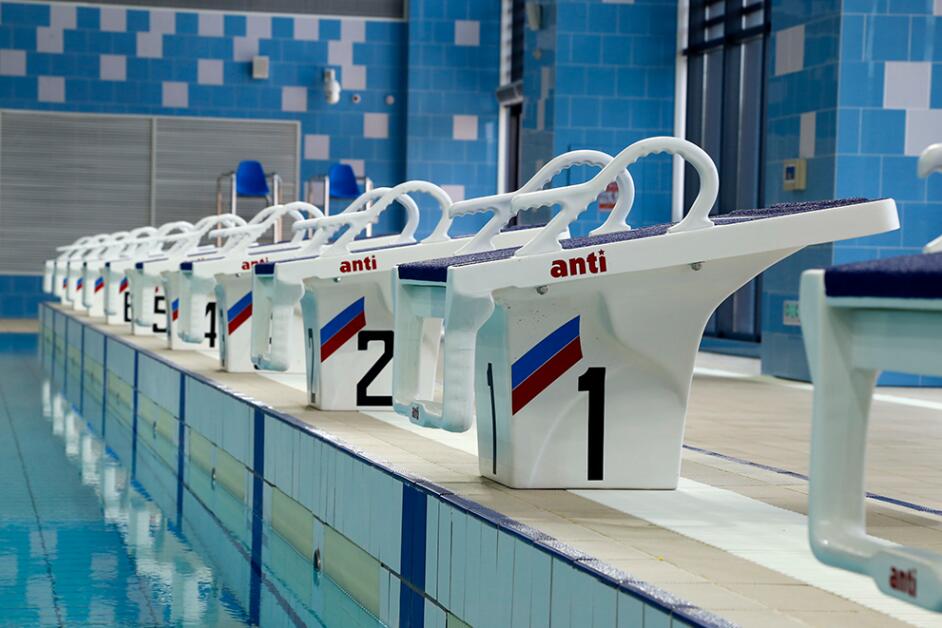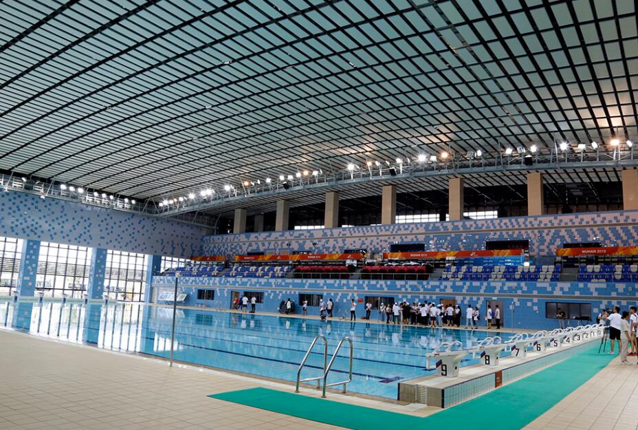 游泳馆设计为国际单项比赛甲级游泳馆,全天候恒温游泳池,馆内设有10条泳道比赛池,屋顶设计有18个自动天窗,通过特殊工艺处理,既保障通风采光,又节能环保。地砖引进的是国际田联认证的标准材料,光脚踩在上面,脚部感觉不仅防滑,还很柔和舒服。相比训练池,除了恒温以外,比赛池给人最大的感受就是安静,据介绍,比赛池上空采用的是天平板空间吸声体,与墙面上的陶艺吸声体,共同组成了一个吸声系统,能够保证混响时间小于2.5秒,让参赛者和观赛者处于一个极为安静的环境中,同时也避免赛事转播过程受到过多干扰。