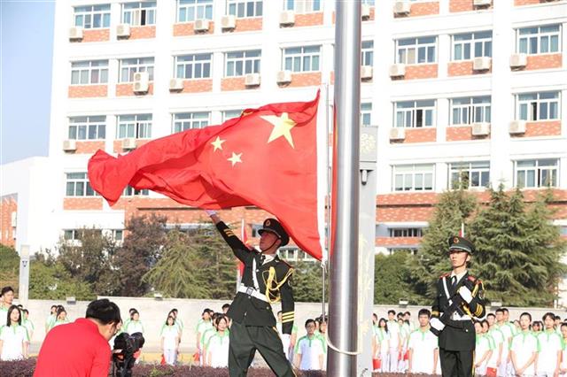 当天早上8时,在校园内致远广场上,1200余名师生围绕国旗台呈扇形站立,国旗台前的人群方阵红蓝相间,呈现“70”字样。国旗护卫队昂首挺胸,迈着整齐划一、铿锵有力的步伐护卫国旗入场。在雄壮的国歌声中,鲜艳的五星红旗冉冉升起,全体师生高唱国歌并向国旗行注目礼。国旗升起,国歌结束。围绕广场的师生手执国旗挥舞,高唱《我和我的祖国》,用歌声向新中国70年周年献礼。