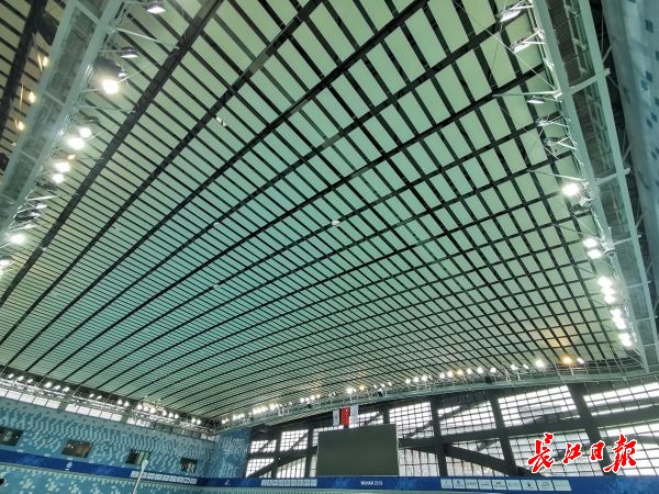其次,场馆运用了“采光孔+海绵城市建设技术”,恒温游泳馆屋顶设有18个直径各1米的采光孔,通过特殊工艺处理,既保障通风采光,又节能环保。