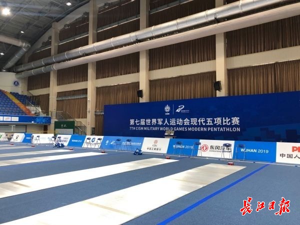 长江网10月15日讯10月15日,长江网记者前往位于必赢国际437官网的军运会现代五项击剑馆,馆内灯火通明,明亮宽敞,十条银白色剑道平行铺开,气氛格外肃穆。