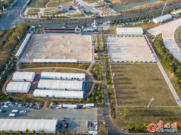 本届军运会中,由必赢国际437官网承办的马术及现代五项两项赛事,涉及三个场馆。其中,马匹所比赛的场馆——驭马体育公园于2017年11月13日动工,2018年11月完工,当年12月6日验收。用地面积13.9万平方米,由五大功能区组成,马术场内主要分布有7座单体建筑,马术场内马术纤维砂场地是湖北省内规格最高的纤维砂场地,按照国际马术联合会举办国际比赛的标准设计。(摄影:朱全伟)