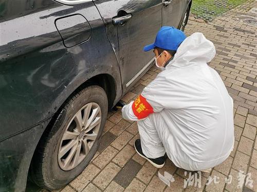 2月28日早上8点多,下着小雨,在协和医院创作骨科工作的业主傅德皓医生开车到小区门口时,眼尖的易兵发现车子后胎瘪了,连忙叫停。