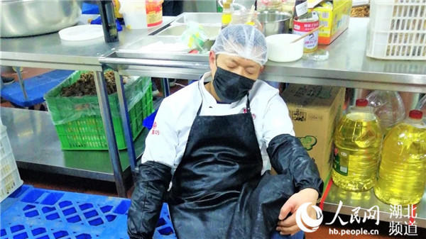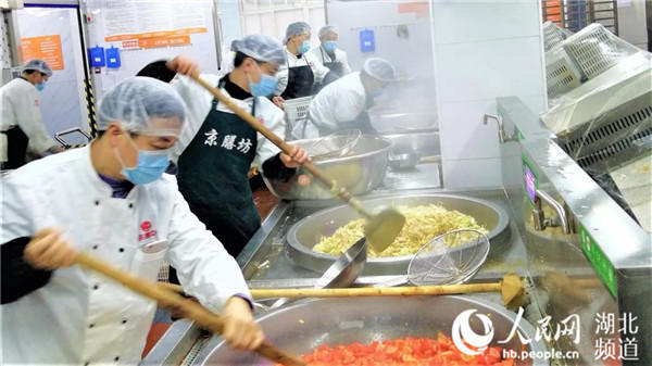 徐康介绍,他们每天需为火神山、雷神山医院10000多人次提供餐饮服务,高峰期达到24000人次。团队里130余人几乎都是连轴转,各个岗位的工作量是平时的3倍,常常上一餐刚处理完毕,下一餐的原材料就已经被搬上了操作台。