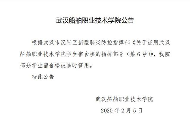 武汉市新型冠状病毒肺炎疫情防控指挥部从2月7日起,起征用学校南区学生宿舍,用于全市疫情防控工作,实行封闭管理。征用期限另行通知。