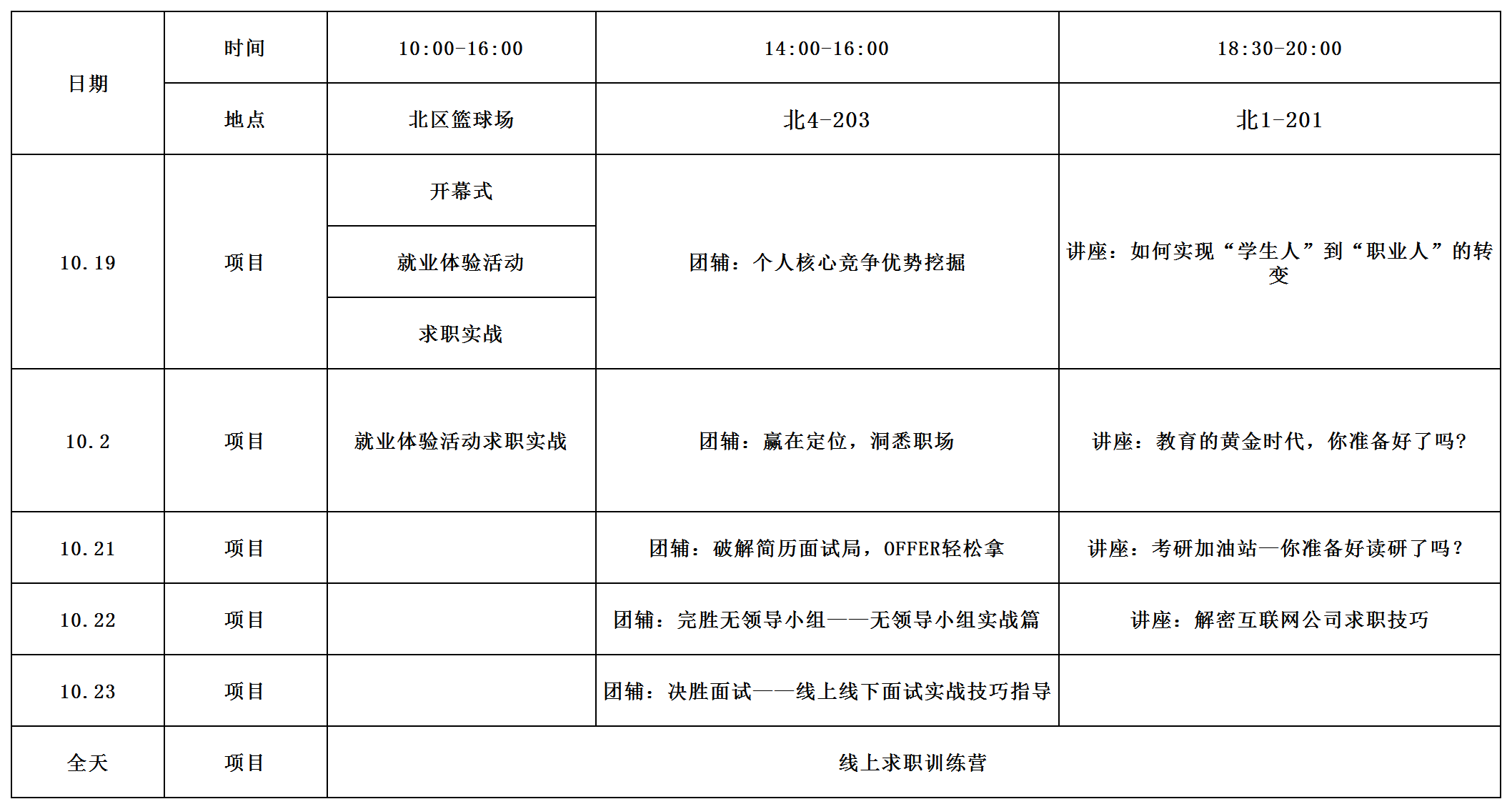 就业体验周将就业指导课程设计成系统的活动,旨在通过一周的活动,为学生提供各种直接参与、有所体验、激发行动的机会(如进行自我目标定位、自我探索、外界探索、决策行动),切实提高学生的就业清晰度以及简历制作、面试准备等求职技巧。