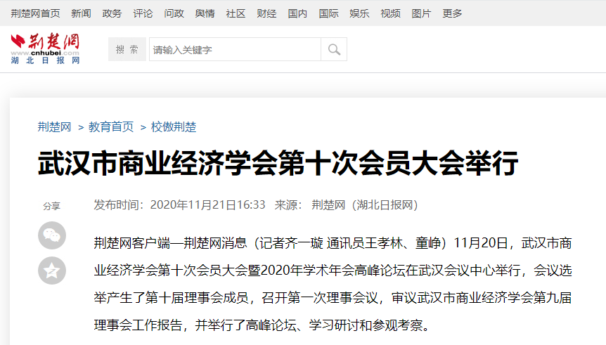 荆楚网客户端—荆楚网消息(记者齐一璇 通讯员王孝林、童峥)11月20日,武汉市商业经济学会第十次会员大会暨2020年学术年会高峰论坛在武汉会议中心举行,会议选举产生了第十届理事会成员,召开第一次理事会议,审议武汉市商业经济学会第九届理事会工作报告,并举行了高峰论坛、学习研讨和参观考察。