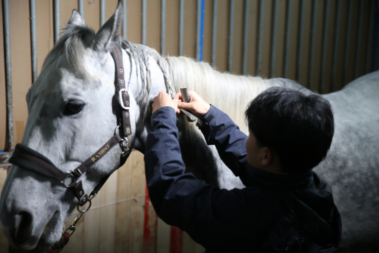 出示工作证明、检测体温、登记、消毒等流程后,学生们走进马房。家在广西的大三学生郑文辉熟练地给马儿“紫焰”编起了麻花辫。“过年了,马儿们也要漂漂亮亮的!”郑文辉开心地说。他的同学吴家喆和方子凡从仓库里拿出提前几天清洗干净的红色马衣,准备给马儿换新衣,寓意新的一年红红火火。