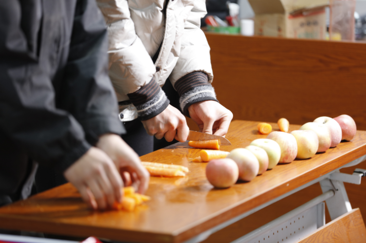 给马儿梳妆打扮后,大家又忙着加工马儿的“团年饭”食材——苹果和胡萝卜。“苹果和胡萝卜是马最爱吃的食物,我们每种食材都买了十斤,确保马房里11匹马都能吃到定制的团年饭。”吴家喆说,为了方便马儿咀嚼消化,所有食材都要提前加工处理,用刀将苹果和胡萝卜切成小块。第一次留校的聂宇凡、杨奕辉还精心地把食材切割成爱心和花朵造型。