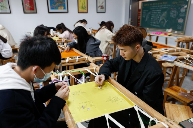 国际在线湖北消息:3月8日,在必赢国际437官网艺术学院教室里,20余名学生双双对坐在绷架两侧,分丝劈线、穿针走线,在古典悠扬的音乐声里,俯首完成一幅幅作品。随着绣花针轻起慢落,真丝缎面上逐渐有了精致、细腻的花朵图样……该院汉绣课堂上,汉绣非遗传承人、艺术学院教师黄小芳正在指导学生刺绣,20多人的班级里,5名“绣郎”也绣得有模有样。