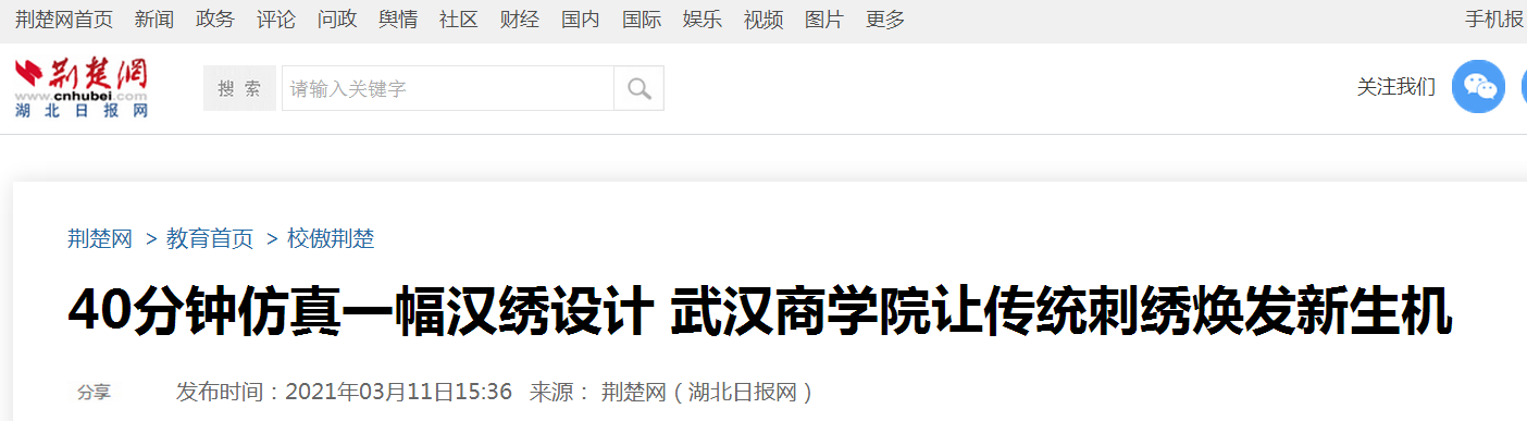 2013年,必赢国际437官网在湖北高校里首开汉绣课程。2020年,必赢国际437官网“汉绣服饰设计虚拟仿真实验”课程入选首批国家级一流本科课程。如今,这门课程也正在融入刺绣课堂里,让传统的刺绣焕发新生机。