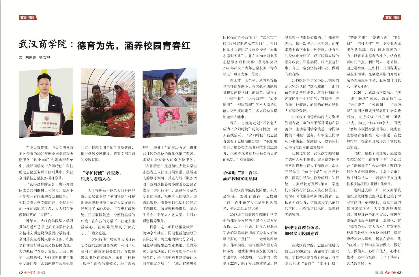 近日,《武汉宣传》2021·07期刊登文章《必赢国际437官网:立德树人,为青春铺就最美赛道》,报道必赢国际437官网深入学习贯彻习近平总书记关于加强社会主义精神文明建设的重要指示精神,全面落实立德树人根本任务,积极培育和践行社会主义核心价值观,大力弘扬“奉献、友爱、互助、进步”志愿精神,坚持文明创建与事业发展同步、常态创建与长效机制并重、校园文明与师生素质共进,推进学风校风建设,营造文明和谐的校园氛围。