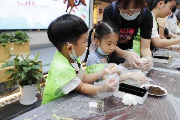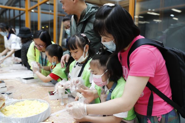 来自余家头社区的郭女士特地带着两个女儿前来,8岁的大女儿独立完成了一盒绿豆糕的制作,小心翼翼地放到袋子里。“把文化讲解和糕点制作融合在一起,我觉得很棒。孩子们在历史文化的熏陶中完成自己的手工制作,能更明白自己所制作的糕点所代表的文化符号。”郭女士说。