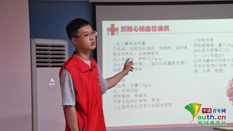图为志愿者在向社区群众介绍怎样预防心脑血管疾病。