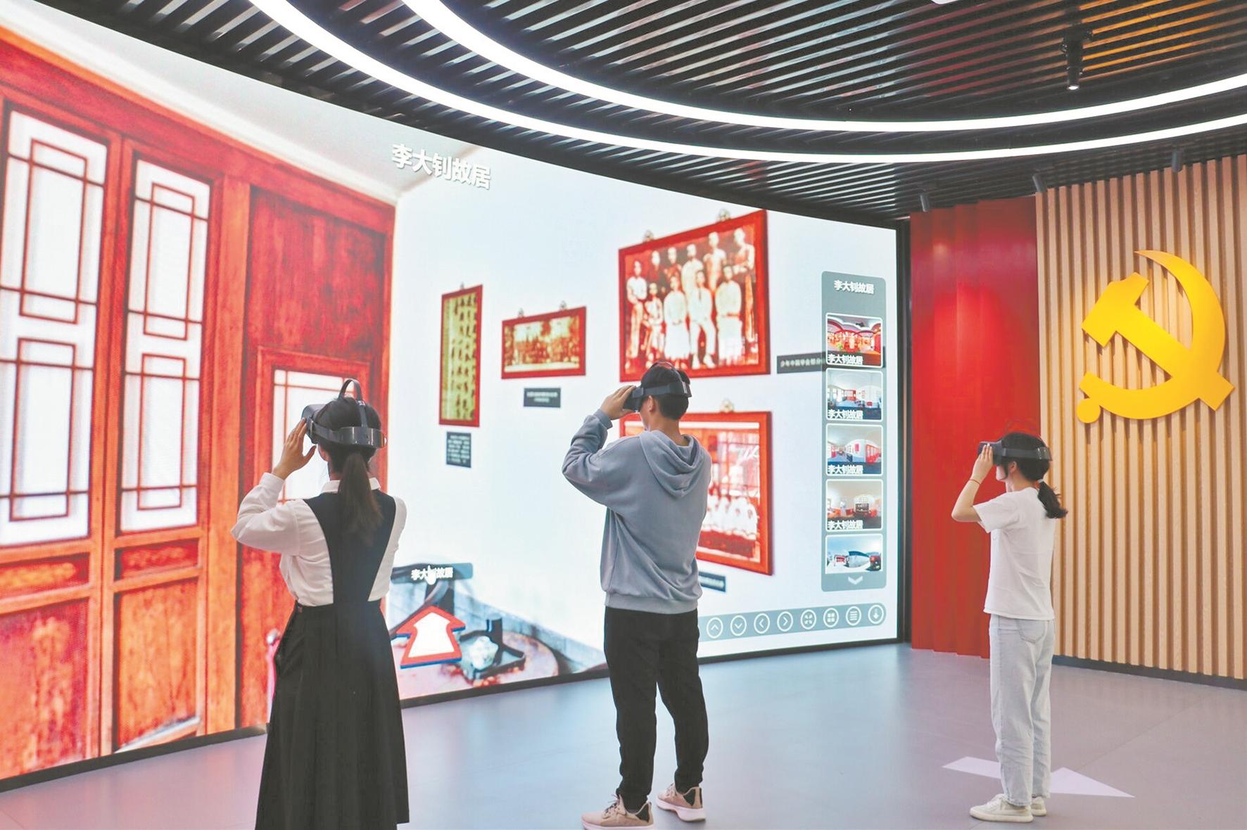 通过多媒体和大数据,学生们在智慧党建教育中心可以一“键”解锁中国共产党发展史重大历史事件,游览145个虚拟红色革命教育基地,开展“沉浸式”党史学习教育,让红色教育“触手可及”。戴上VR眼镜,大三学生童峥打开了党史学习的“任意门”。轻轻一点,童峥“穿越”到福建省古田村,见证了中国共产党和工农红军发展史上有着极其重要意义的“古田会议”。“这样的体验让人身临其境,感觉更震撼。”童峥说。