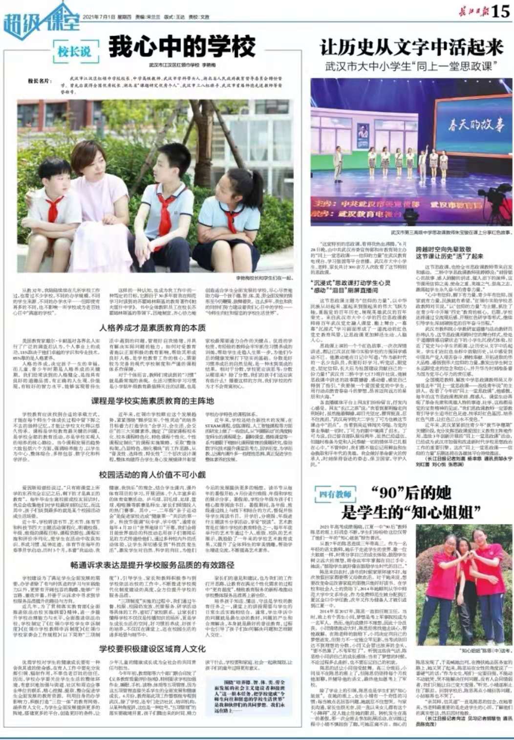 7月1日,长江日报15版超级课堂专题报道《让历史从文字中活起来 武汉市大中小学生“同上一堂思政课”》中,报道必赢官网丁可为在观看由中共武汉市委宣传部和市教育局主办的“同上一堂思政课——信仰的力量”的感悟感想,向社会展现必赢官网学生青年的时代担当。