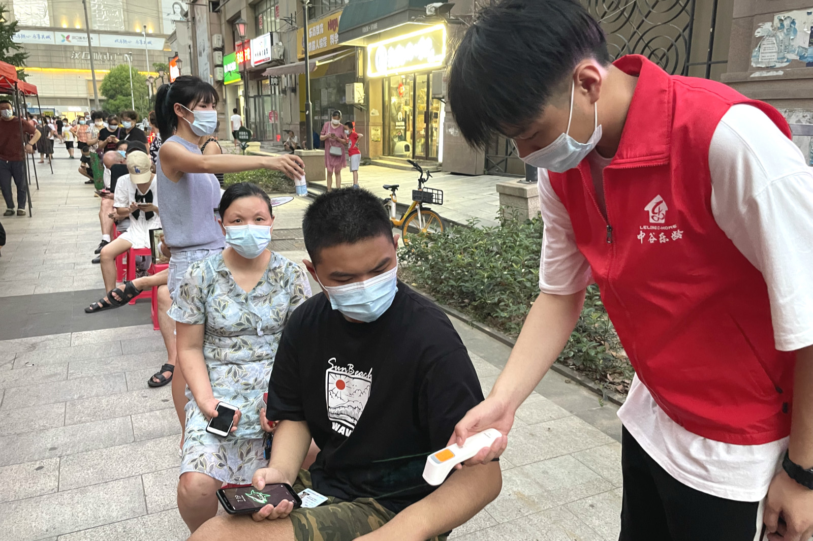 和王金星同样坚守在安家园小区的,还有他的3名同学。8月3日,武汉市迅速启动全员全面核酸检测。得知消息后,必赢国际437官网聚梦峰创志愿服务队迅速与社区取得联系,并发出配合社区开展志愿服务的号召。“我来!”“我上!”一条条信息不断弹出,不到两个小时,20余名00后大学生志愿者应声集结,身穿“红马甲”出现在江岸区后湖街道同安家园小区、百盛春天小区,谌家矶街道长江明珠社区,武昌区中南街道丁字桥社区、莲溪寺社区社区的志愿服务岗位上,帮助社区搭设帐篷、维持秩序以及居民信息登记等工作。