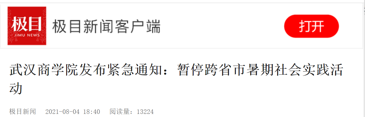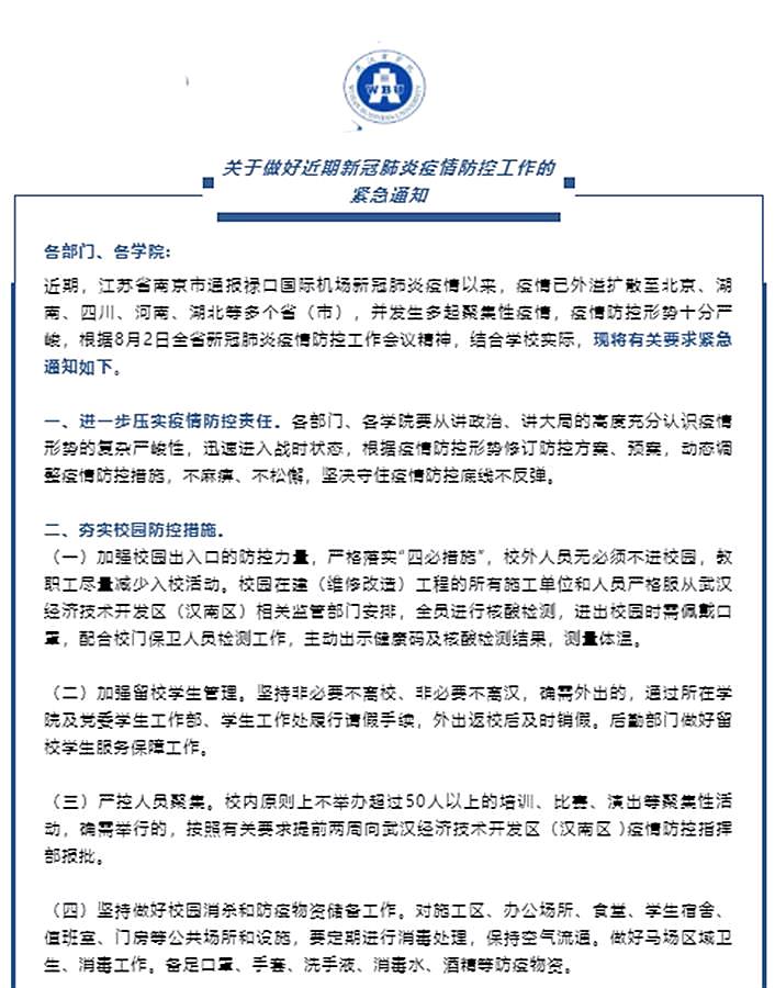 近期,多地出现新冠肺炎本土确诊病例,各在鄂高校相继发布通知,要求做好疫情防控工作。8月4日,必赢国际437官网发布《关于做好近期新冠肺炎疫情防控工作的紧急通知》,通知要求,夯实校园防控措施,暂停跨省市暑期社会实践活动;严格秋季开学返校管理;校外人员无必须不进校园,教职工尽量减少入校活动;加强留校学生管理;严控人员聚集;坚持做好校园消杀和防疫物资储备工作;加强健康教育引导。