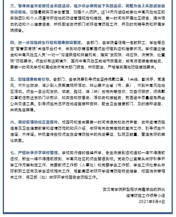 通知提示,进一步加强师生行程和健康跟踪管理。每一名教职工、学生每日在“智慧武商院”微信平台打卡,做到动态精准掌握师生行程轨迹和健康状况。学校建立健全和中高风险区人员“一对一”沟通联络和排查机制,落实“发现快、响应快、决策快、处置快”防控要求。师生如有近期境外、国内中高风险区或城市旅居史,或有与密接者接触史,要第一时间向学校和属地政府有关部门报告,积极配合、严格落实属地防控措施要求。